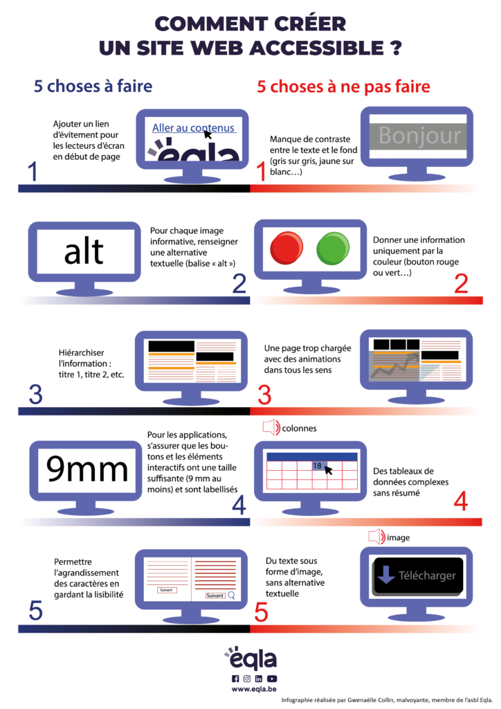 L’accessibilité numérique étant une démarche progressive, Eqla recommande d’appliquer ces quelques bons réflexes pour améliorer l’accessibilité de vos contenus numériques :