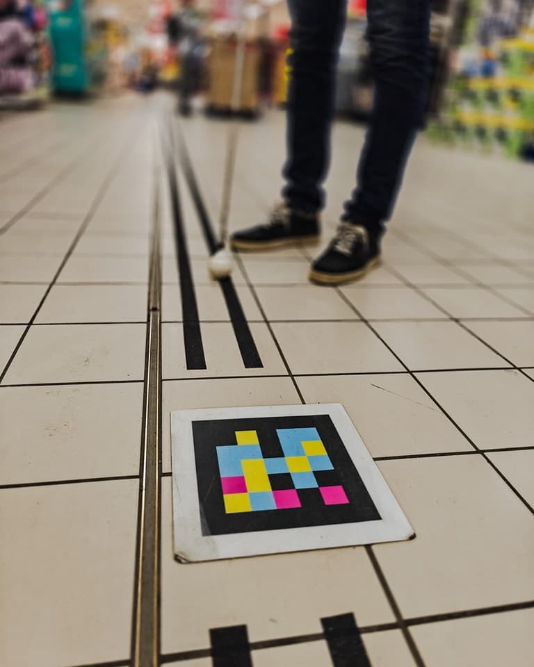 Au mois d’avril, plusieurs membres d’Eqla ont testé en exclusivité l’application NaviLens et la nouvelle signalétique numérique dans le Carrefour d’Auderghem. Aveugle depuis dix ans, Chris, formateur des Clubs « Nouvelles technologies » d’Eqla s’engage dans les allées du magasin Carrefour. Sa canne blanche dans une main, son smartphone dans l’autre, il balaie les différents rayons du magasin à la recherche des QR codes.