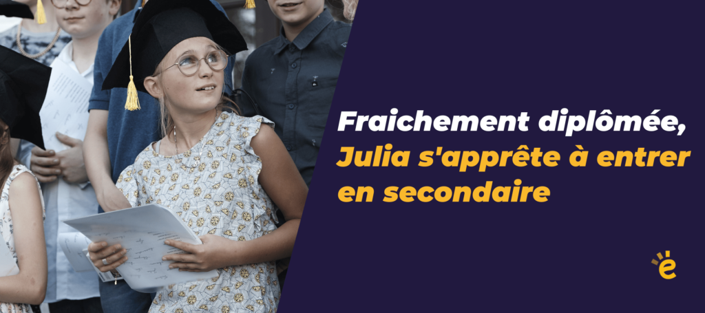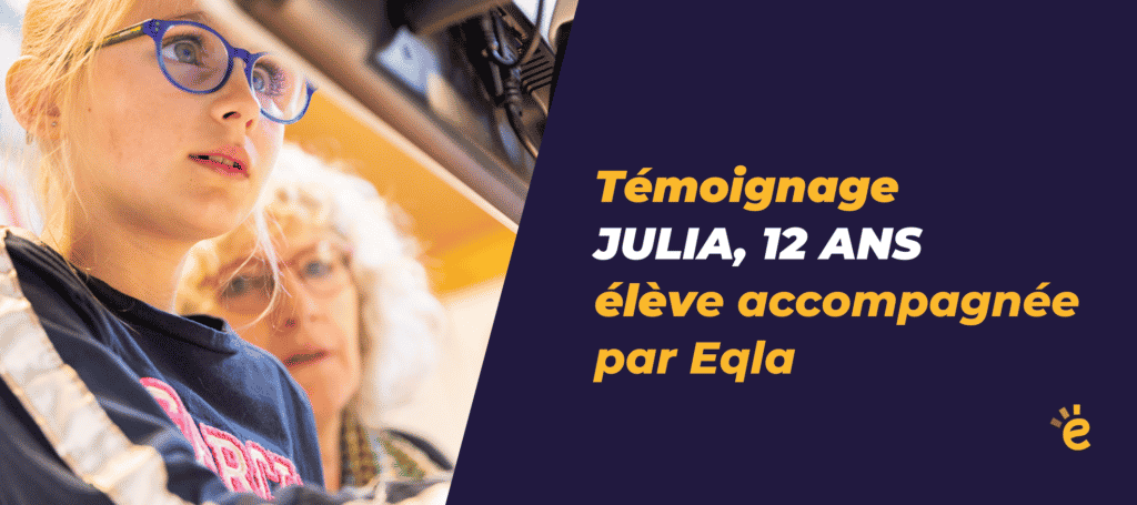Julia, 12 ans, est accompagnée depuis 6 ans par Eqla. Elle vient de terminer ses primaires. Toutes nos équipes sont engagées à ses côtés pour qu’elle puisse continuer à suivre ses cours dans l’enseignement ordinaire, comme tout le monde…